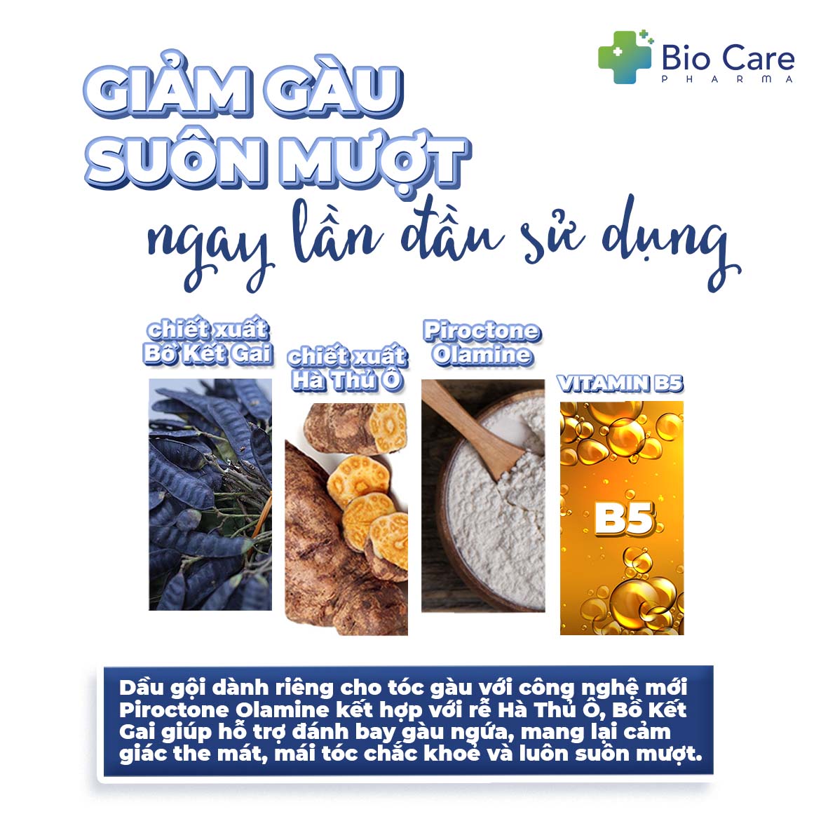 Dầu gội Biocare Pharma chứa thành phần Piroctone Olamine và Bồ Kết Gai, Hà Thủ Ô, các thành phần được chứng minh có khả năng ngăn ngừa và giảm thiểu nấm gầu trên da đầu. Ngoài ra, dầu gội này cũng chứa Vitamin B5, giúp tăng cường quá trình phục hồi và nuôi dưỡng da đầu, cải thiện sức khỏe và độ đàn hồi của tóc.