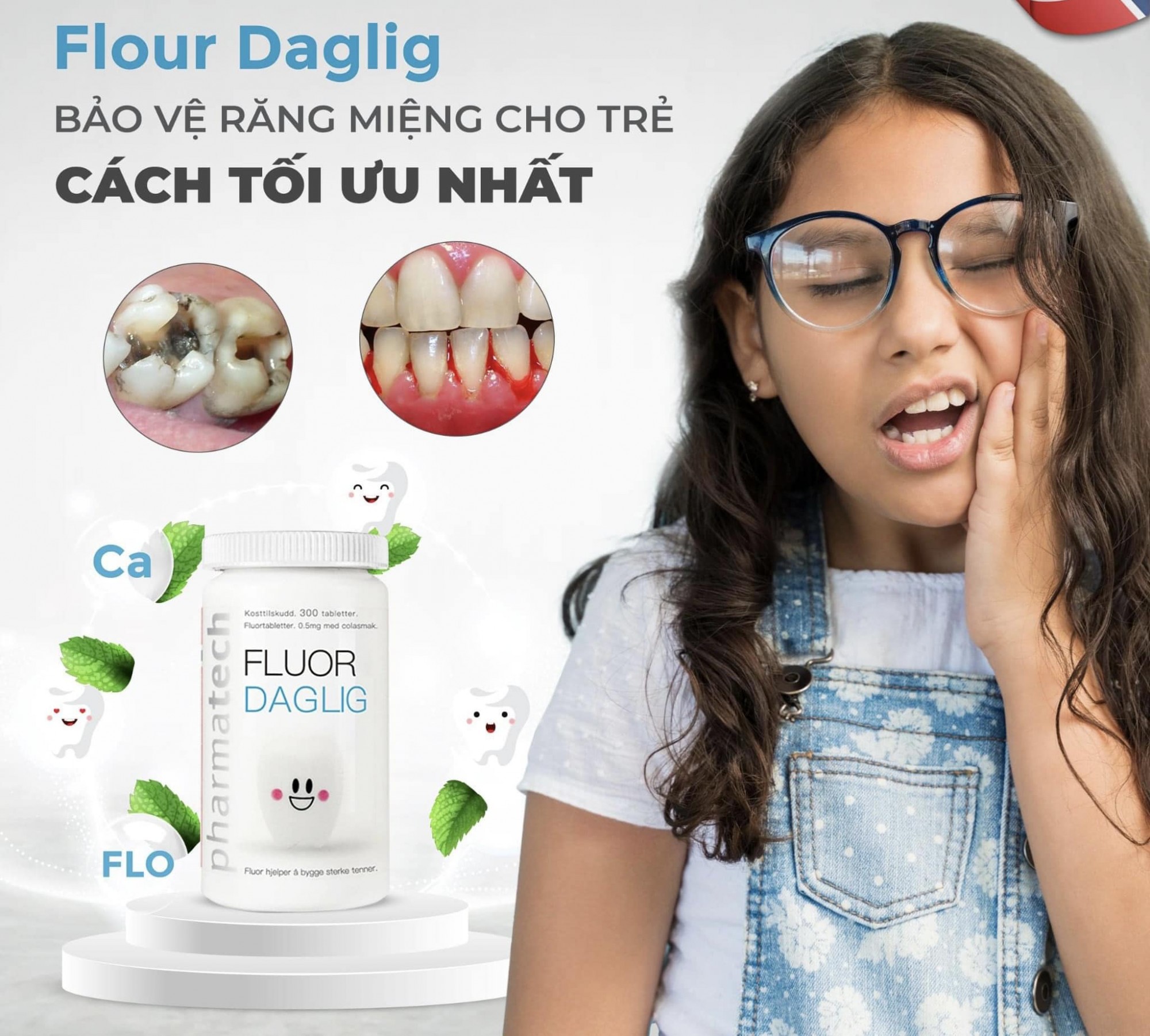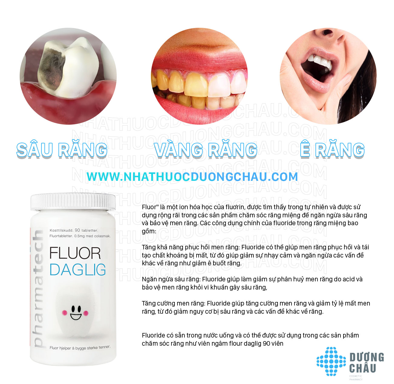 Việc sử dụng sản phẩm chứa fluoride như viên ngậm chứa fluoride hay nước súc miệng có fluoride có thể giúp bảo vệ răng khỏi sự hình thành của sâu răng và giảm nguy cơ mắc các vấn đề liên quan đến răng miệng như ê buốt răng.Fluor Daglig là một sản phẩm được ưa chuộng bởi những người muốn giữ gìn sức khỏe răng miệng của mình và giảm rủi ro bị mắc bệnh răng miệng như ê buốt răng, viêm răng và tủy răng. Sản phẩm còn giúp tăng độ trắng răng.Fluor Daglig có thể sử dụng trong nhiều cách khác nhau, bao gồm sử dụng trực tiếp hoặc trên răng và miệng hoặc kết hợp với các sản phẩm chăm sóc răng miệng khác như kem răng, nước rửa miệng hoặc bột răng. Để sử dụng, người dùng chỉ cần ngậm 1 viên Fluor Daglig Fluor Daglig có thể mua được tại các cửa hàng y tế hoặc trực tuyến tại website của nhathuocduongchau.com. Sản phẩm được bán với giá cả phải chăng và có thể sử dụng cho mọi lứa tuổi.bạn có thể giữ gìn sức khỏe răng miệng của mình và tránh những vấn đề như viêm răng, đau răng, tái phát viêm và nhiều vấn đề khác. Tuy nhiên, nếu bạn gặp bất kỳ vấn đề nào về răng miệng, hãy trực tiếp đến bác sĩ hoặc chuyên gia răng miệng để được tư vấn và chăm sóc.